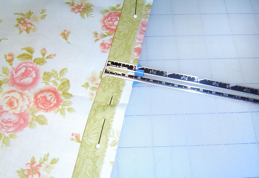 - The Honey Bun flange in our sample is designed to show about ½” out from the seam between the trim and pillowcase body. This means we have to pay attention to where we position the flange. The folded strip should be ¼” from the raw edge (or a total of 1″ from the fold to the raw edge) along each short side of each pillowcase body (the 21″ side). Measure and pin in place.