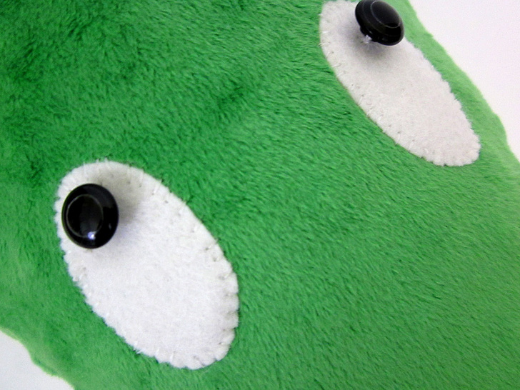 - Hand stitch the button eyes in place. Check the pattern piece for placement. The eyes should be centered at the top back of each felt oval. This position is what gives the crocodile his particularly “sneaky” look!