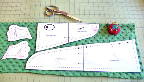- Place the pattern pieces on the Fleece Dot as shown below, following the indications on the patterns themselves, and pin in place. As shown, the head pattern is cut on the fold.