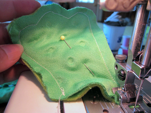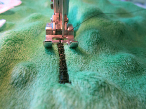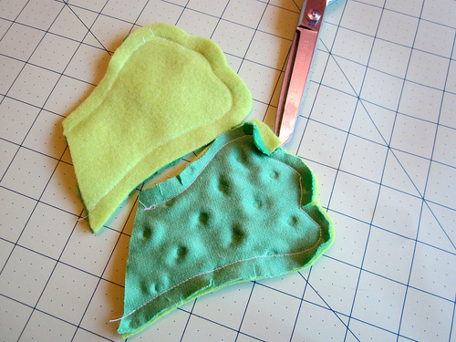 I used a scrap of synthetic leather left over from someone else’s very realistic green dinosaur costume, and green wool for the other side.