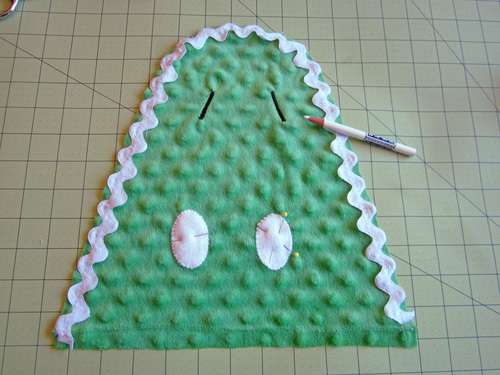 - Place the jumbo rick rack un-evenly along the back seam of one body piece. It should be placed so it is just visible at each end with the maximum amount showing in the middle. This allows it to curve up, out, and back down again from the finished seam… just like a real spine.