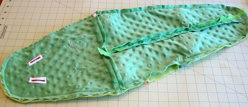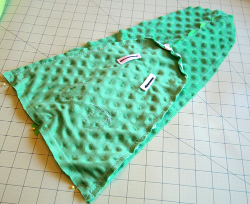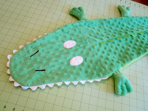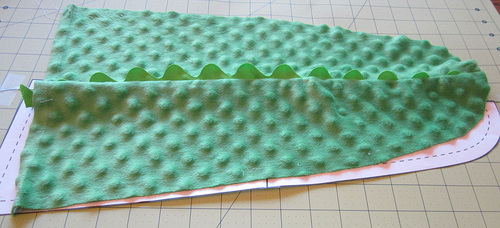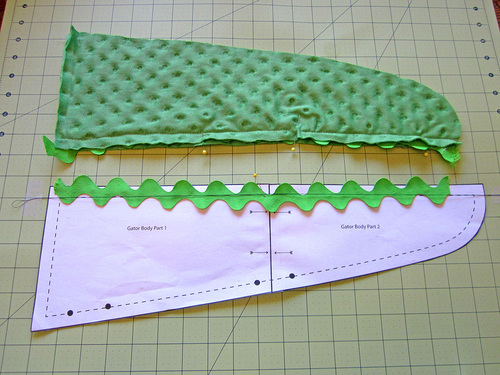 - Place the finished crocodile top on the solid fleece. Use the top as a pattern to cut out the solid fleece (the crocodile belly) as one piece.