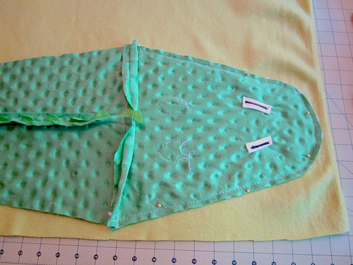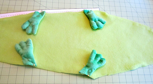 - Using the marks on the original pattern piece as your guide, pin the four feet to the solid fleece belly. The solid fleece bottoms of the feet should be against the solid fleece of the belly. The feet should be slightly angled: the front feet angling towards the head, the back feet angling in the opposite direction toward the tail.