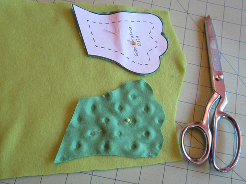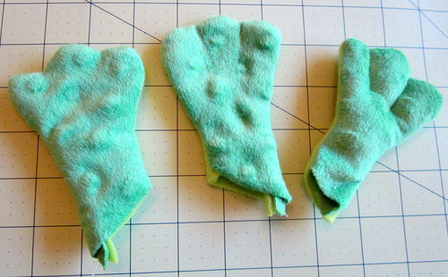 - Similarly, use the textured dot feet tops to cut four feet bottoms from the solid fleece.