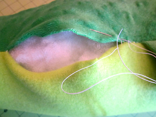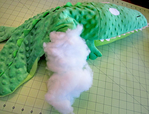 - Stuff with fiberfill so he is soft and squeezable, but still stays sleek and stealthy, like a good crocodile should. He shouldn’t be rock hard. As we mentioned above in our supply list, we used one full 8oz bag of polyester fiberfill.