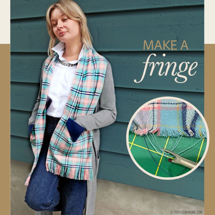 Steps are shown for how to create the fringing along the bottom of the scarf. Full disclosure: this technique is handwork and a bit time consuming, but it’s actually easy and oh so worth it. We created a deep 2½” fringe for a super lush look. This is just the opportunity you’ve been looking for to binge watch your favorite TV series.