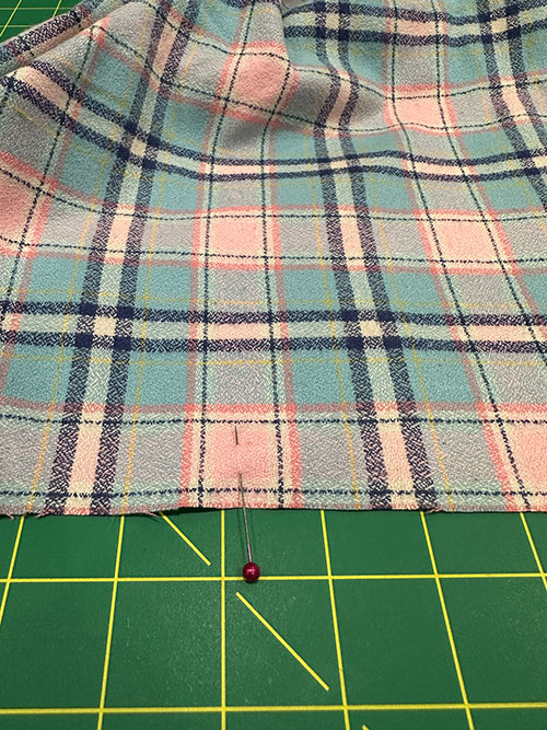 - The finished width of the cut should be 23”. Measure half that amount (11½” ) to the right from your center point pin. In a perfect world, this measurement will hit a stripe within the plaid. If it doesn’t, it’s okay to slightly cheat your measurement wider or narrower to best align with a stripe. We do mean slightly! Don’t shift by an inch or more, just a fraction of a difference to the stated measurement (11½”).