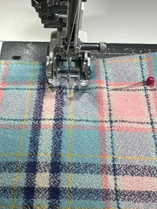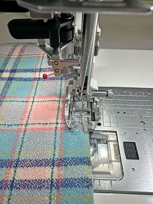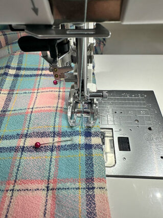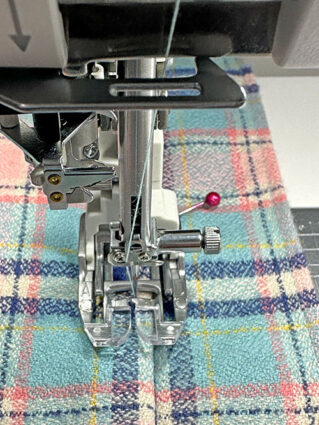 - Attach an Even Feed/Walking foot or engage your machine’s built-in feeding system; such as the Janome AcuFeed™ Flex built-in system, which is what we used. As mentioned above, this is optional – you could use a standard presser foot and regular feed dogs, but when matching plaid, a dual feed set-up for your machine will help keep the pattern of the plaid aligned.