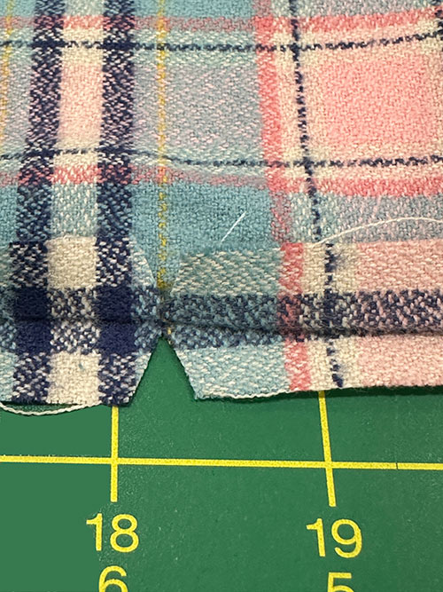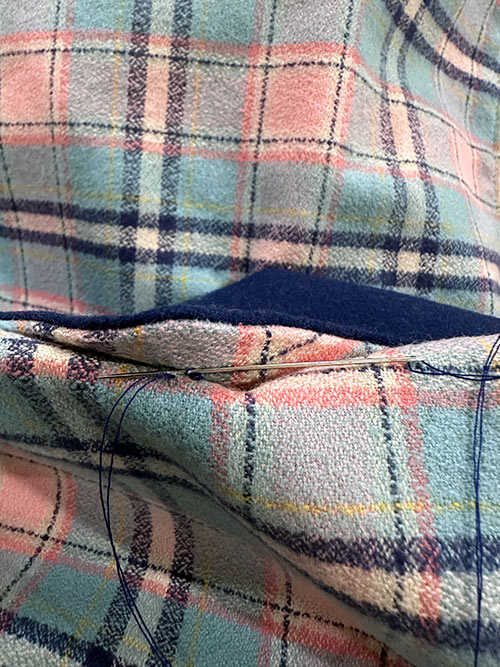 - Thread a hand sewing needle with thread to best match the pocket lining fabric, and make a small hand tack through the inside of the pocket, catch the point of the flap through just the back layer of the point (the plaid layer). This tack is optional, but with a pocket that is specifically designed for reaching your hands in and out to help keep them warm, it helps insure the fold of the flap stays flat.