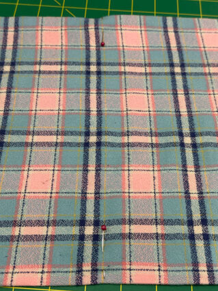 - Place your plaid fabric flat to determine your center point. In other words, the point where you will fold the main cut in half. Look for a good balance of the plaid’s motif side to side. We chose a pink vertical stripe that centered nicely between the more dominant narrow navy stripes. Place a pin at this center point.