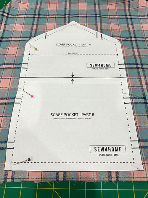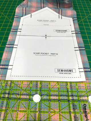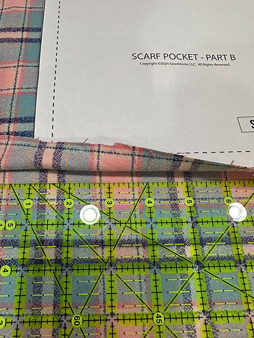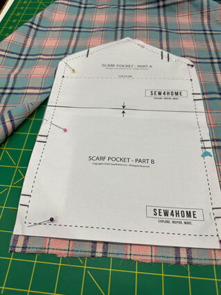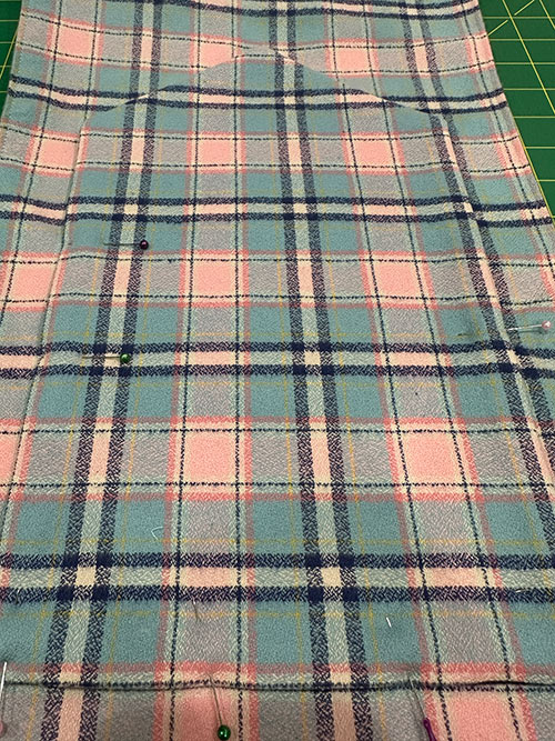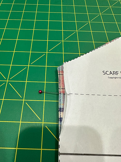 - Remove the paper pattern from the scarf panel and bring it over to the remaining plaid fabric. Move the pattern around on the remaining fabric until your marked points line up to match the scarf panel. Pin the pattern in place on the remaining fabric.