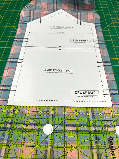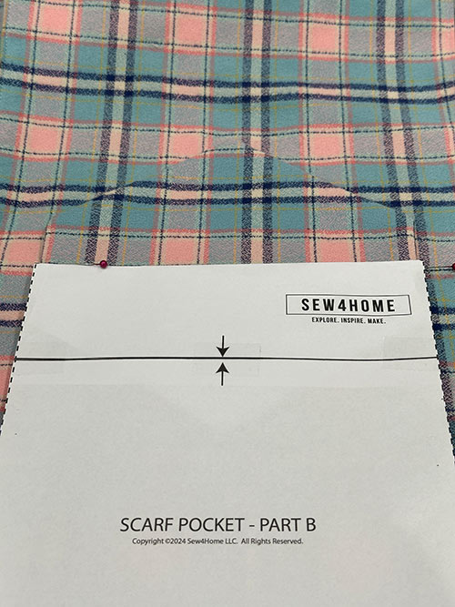 - Find the scarf panel. Unfold the flap of the finished pocket. Because you did such a lovely job of pattern matching and fussy cutting, you can easily place each pocket into position on either end of the scarf panel.