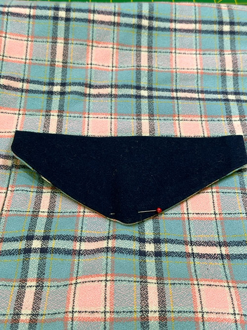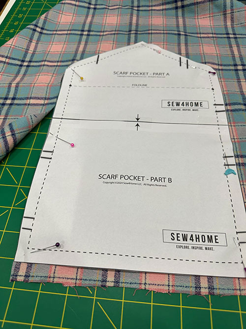 - Finish pinning each pocket in place, once again taking special note to mark your fold line starting and stopping points. Remember, the pocket flap should be open and flat against the scarf panel for this step.
