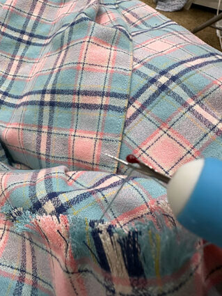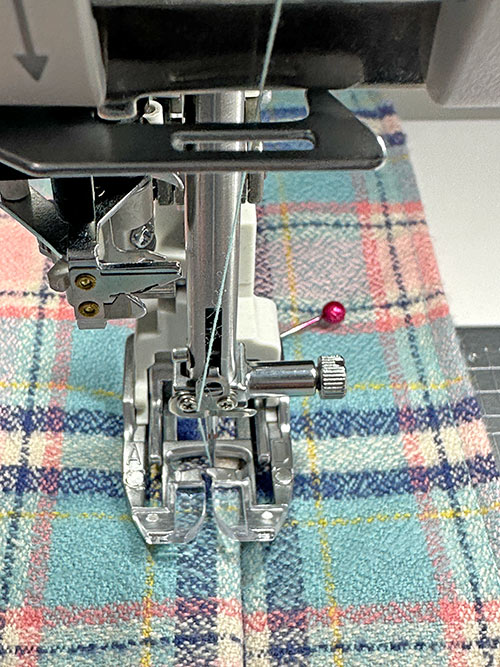 - If necessary, re-thread the machine with thread to best match the plaid flannel in the top and bobbin. We continued to use a light blue thread.