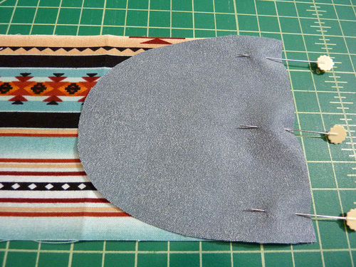 - Edgestitch around the curve of each end cap, starting and stopping at the horizontal line of edgestitching you made above when stitching the end caps in place.
