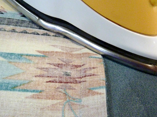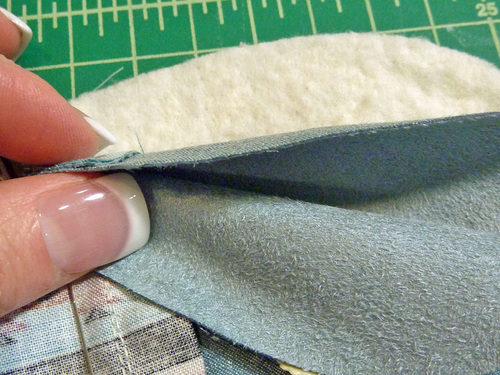 - Press well, turning in the seam allowance along the opening so it is flush with the sewn seam. Use a pressing cloth on the faux suede. Slip stitch the opening closed. As you can see in the photo below, we stitched the opening closed on our sample belt after quilting and attaching the beads, however, we suggest doing it at this point instead.