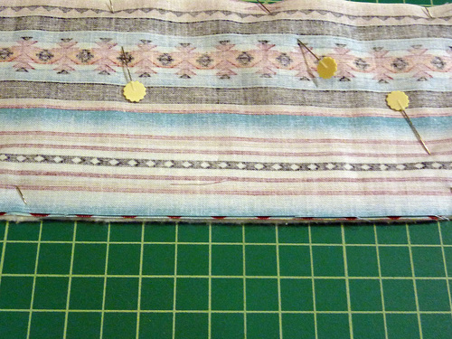 - Pin the layers together, leaving a 3″ – 4″ opening along one long side for turning. Be especially careful to perfectly align the end cap seams.