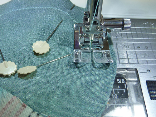 - Go slowly around the curved end caps. To help with the curve, stop as often as need be, with your needle in the down position, and pivot ever so slightly, then resume stitching. A shorter stitch length can also help you make a smoother curve.