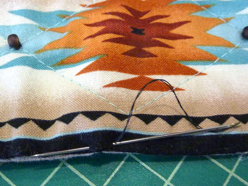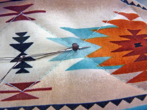 - Be very careful with your stitches and your knots. For our bead sewing, we used brown thread to match the beads, hid the starting knot under the bead, and hand-tied the thread to finish (on the front), trimming the tails close to and under the bead. We stitched just through the top layer and batting, not through to the back of the belt.