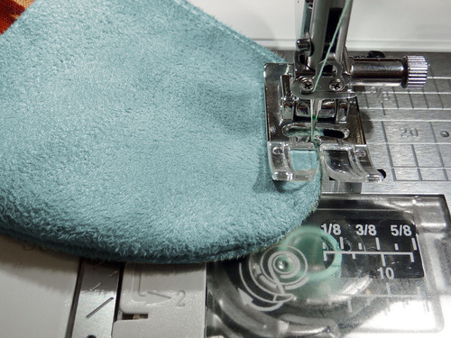 - Using a ½” seam allowance, stitch together around the entire piece, starting and stopping (and locking your seam) at either side of the 3″ – 4″ opening.