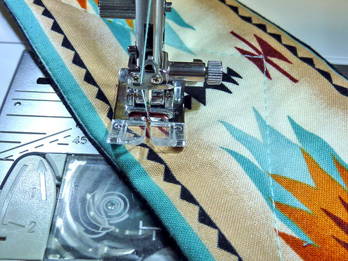 - Choose and re-thread the top and bobbin with a highlight thread color that best coordinates with your fabric. We chose to continue using our turquoise.