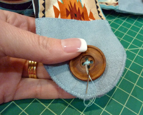 - Again be very careful with your stitches and your knots so the hand stitching looks tidy. For our button sewing, we hid the knot of the thread under the button, by taking a stitch in place prior to laying down the button. We then stitched the button in place through only the top layer of the end cap so there would be no visible stitches on the reverse side. Sew the buttons securely as they well take a bit of stress.