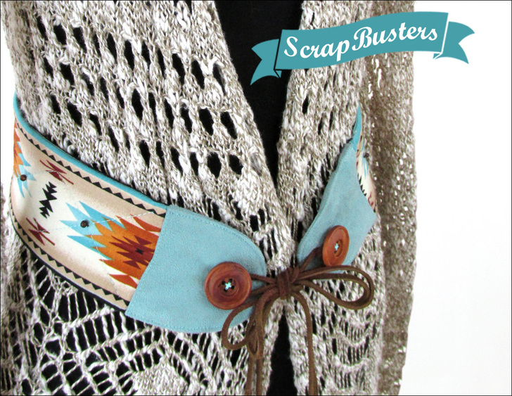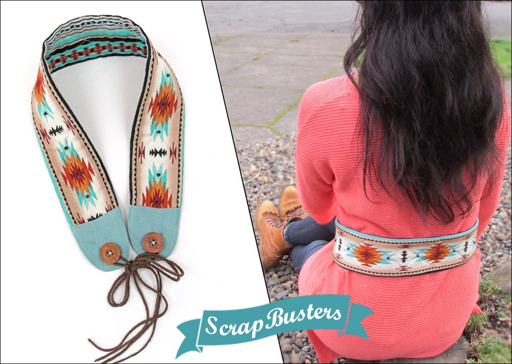 Wide, tie-front belts – sometimes called obi belts, add a touch of bohemian style to your wardrobe. We used long quilting stitches to accent our fabric’s design motifs, then placed a few pretty seed beads at focal points. Faux suede end caps provide the background for the wooden buttons that combine with long suede ties to create the belt’s closure. We’ve packed a huge amount of interest in a very small space.