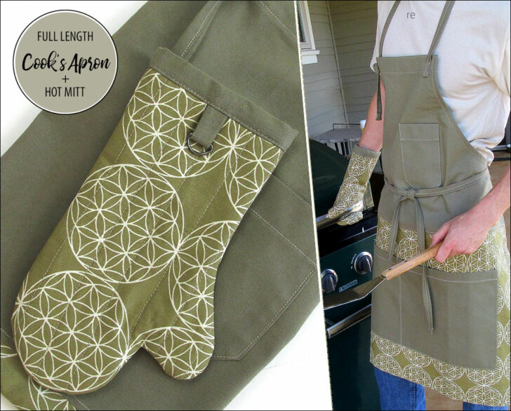 We used the feature print from each apron for a matching hot mitt, adding a coordinating cotton lining and thermal batting between the layers. The entire set would make a great gift for any of your favorite cooks – whether gourmet foodies or good ol’ grillers.
