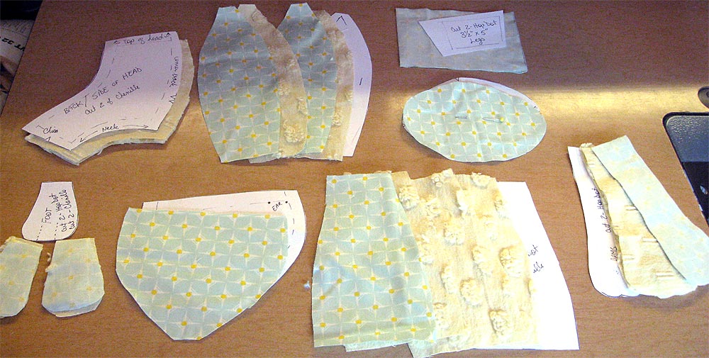 NOTE: Sometimes it’s easier to use the pattern pieces as templates to trace the shapes onto the back of the fabric, rather than trying to cut around small pieces of fabric pinned to paper. It also helps to cut small pieces from fabric that has been ironed with spray starch. - From the chenille, cut the following:
