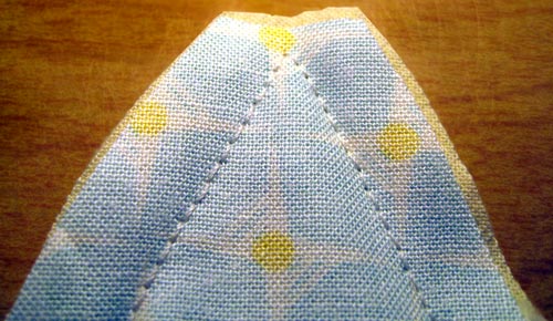 - Place one cotton ear onto one chenille ear, right sides together, and stitch both sides to a point.