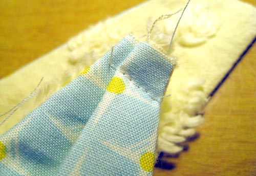 - Take the cotton piece and stitch it, right sides together, to one side of the three-piece chenille unit. You now have four pieces stitched in a row: chenille, chenille, chenille, cotton.