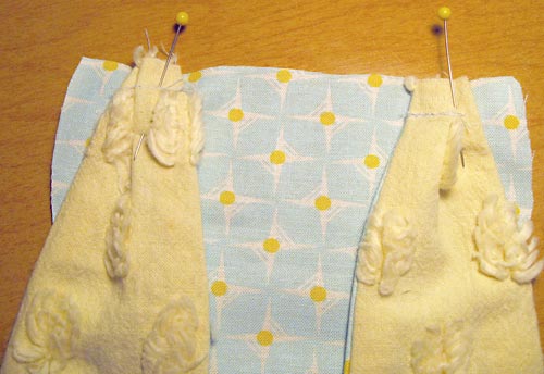 - Using the placement marks you made as a guide, pin the ear to the top edge of the face piece, right sides together (cotton sides together) and aligning the raw edges – so the point of the ear hangs down.