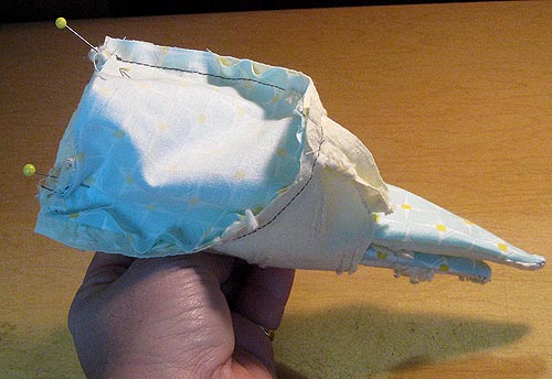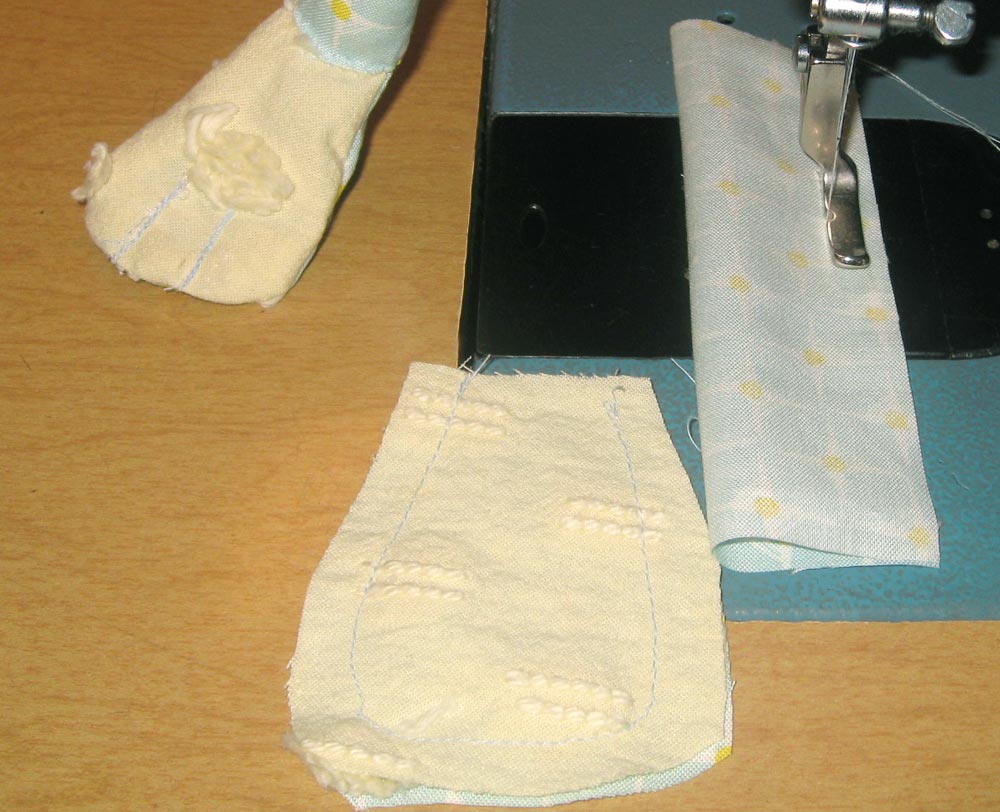 - Stitch all the way around leaving the short straight end (the back of the foot) open for turning.