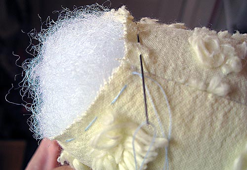 - Double-thread your hand sewing needle with the best thread match possible (to both the cotton and the chenille). Attach the head to the body using a double-length of thread and EVEN slip stitches. Stitch around the neck twice to secure tightly.
