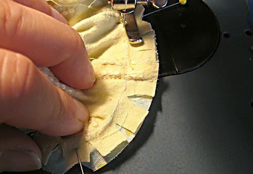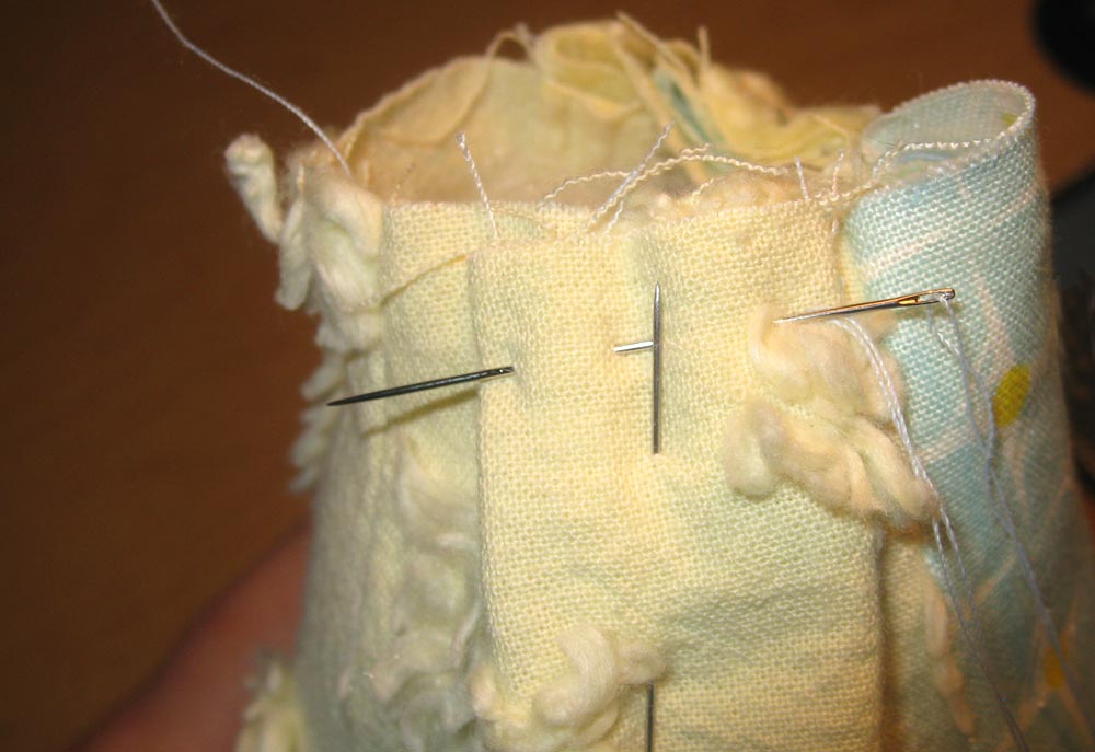 - Using your hand sewing needle, stitch a line of basting stitches around the open neck edge of the head and pull gently to encourage the fabric to fold inward.