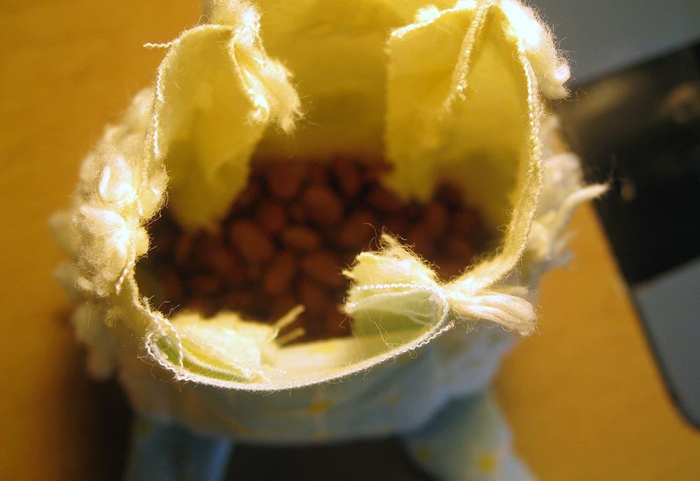 - Turn right side out and stuff firmly. We started with a layer of dried beans and then put the polyester filler over that. The beans help weight Funny Bunny so he can sit up more securely, but they are optional.