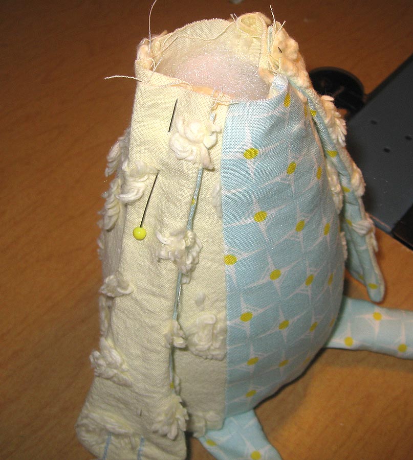- Place the legs onto the body, matching up the raw bottom edge of the body tube with the flattened edges of the legs. The legs are hanging down inside the body. One leg should be centered over each cotton/chenille body seam. Machine baste the legs in position.