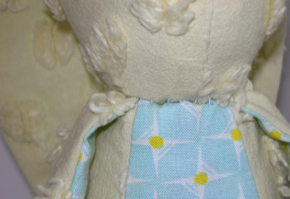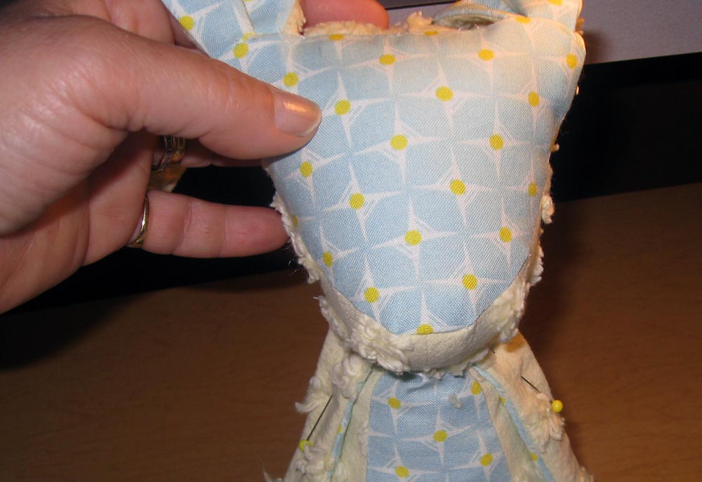 - Find Funny Bunny’s arms, and pin them to the neck edge of the body. Position each arm just slightly forward of the chenille side seams.