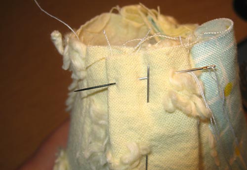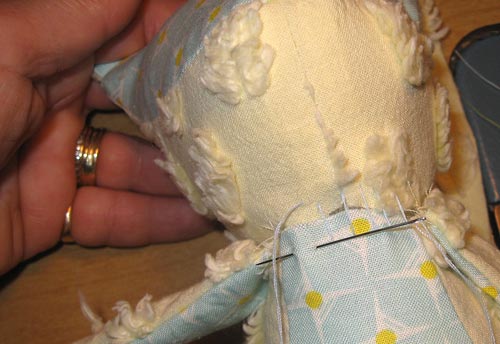 - Set the head back into position on the body, tucking in the raw edges. Pin in position. You can pin to a certain extent, but you’ll have to hold the head with one hand as you stitch.