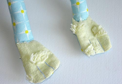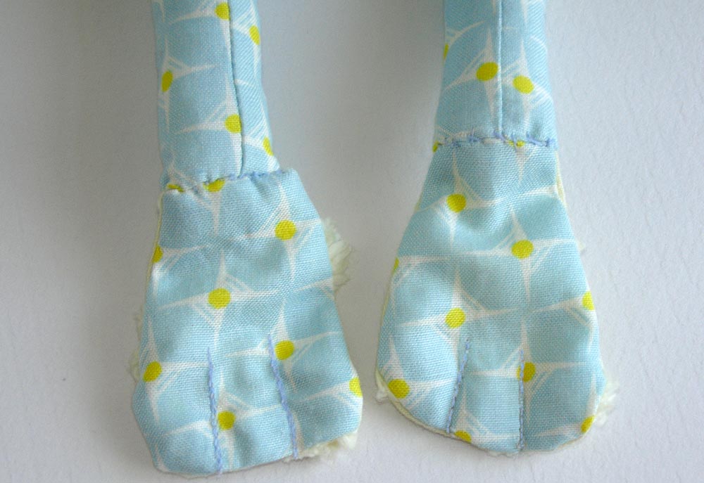 - As you did above for Funny Bunny’s ‘fingers’, use the placement marks you made as a guide and stitch two 1″ seams to create ‘toes’ on each foot.