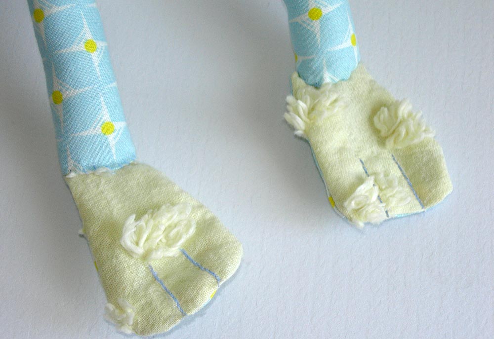 - Fold in the back raw open edges of each foot and slip stitch closed. There is no stuffing in his feet.
