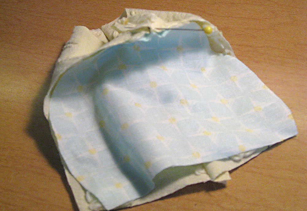 - Using your original placement dots as your guide, match the chin seam to the point of the nose on the face. Pin the curved edge of the sides to the face piece.