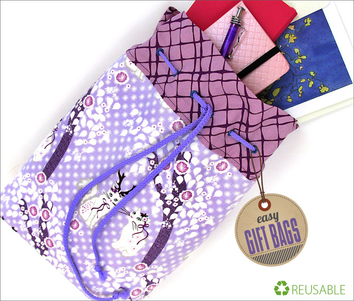 Gift bags are a quick project and a great way to mix and match colors from within a favorite collection or to customize the fabric to the gift recipient’s favorite colors, characters, or themes. Each of our bags uses two different coordinated prints.