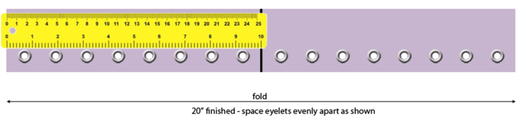 - From the right center eyelet, measure 1¼” to the right and 1¼” down from the folded edge and mark. Repeat an additional six times. You should end up with a total of EIGHT marked points to the right of center.
