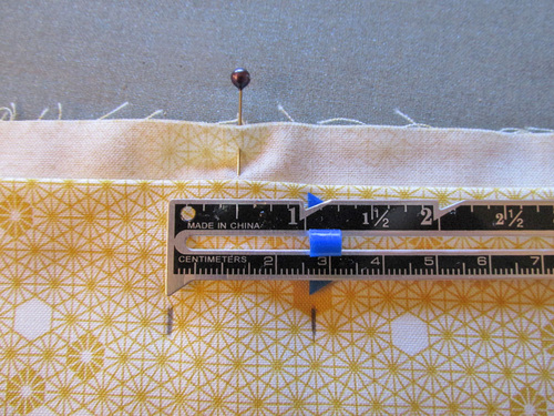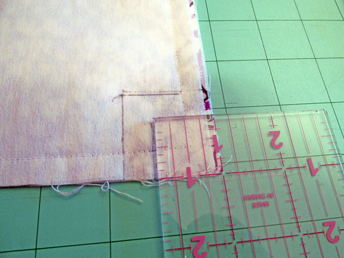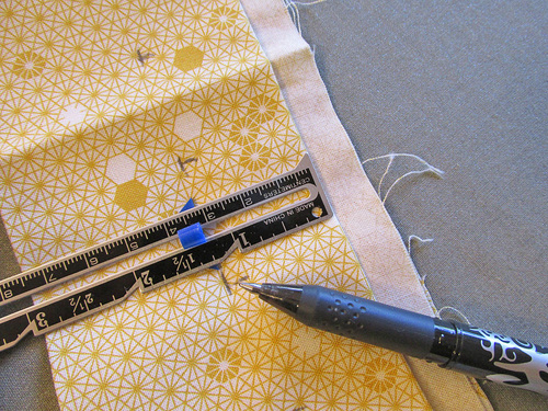 - Measure and mark each corner. We marked both our 1″ square as well as the ½” seam allowance stitching line beyond the 1″ box. In other words, we drew a second 1½” box