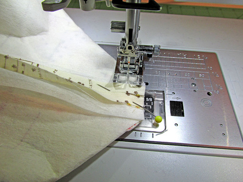 - If you rolled the inner folded edge of band out of the way as we did, unfold it back into its original position. The ½” folded edge should now cover the bag/band seam you just made.