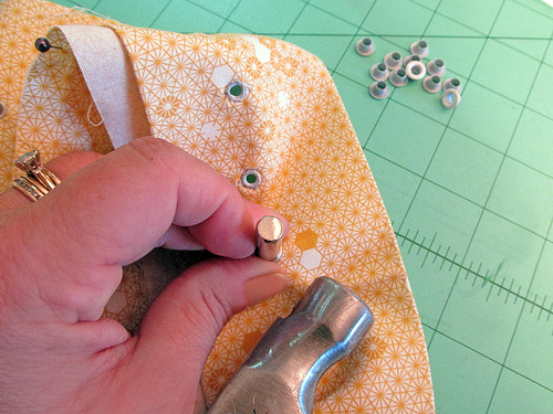 NOTE: Inserting an eyelet is very similar to inserting a grommet. The difference is that an eyelet is only one part while a grommet comes in two halves. If you are new to grommets and eyelets, take a look at our grommet tutorial for great step-by-step photos and instructions.