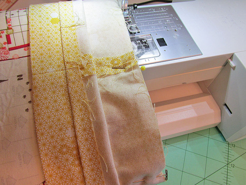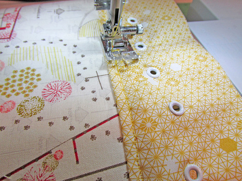 - Using a ½” seam allowance stitch the accent band to the bag. This is a great time to use your free arm if you have one. In the photo below, we rolled our folded edge out of the way, which covered the eyelets.