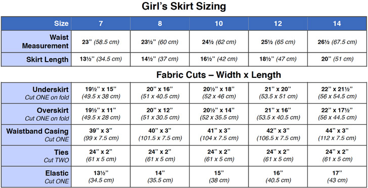 - Use the chart above to determine all cuts for your chosen size. Because the cuts are simple panels, it’s easy to adjust up or down to best match the child for whom you’re making the skirt.