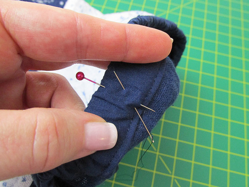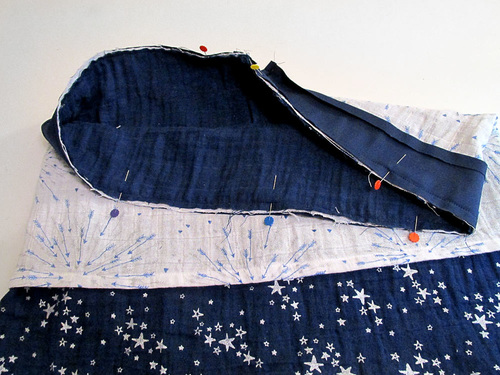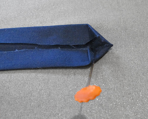 - Edgestitch across the tie/elastic joint, along the long folded edges, and across the pretty pointed end. Do this for each tie.